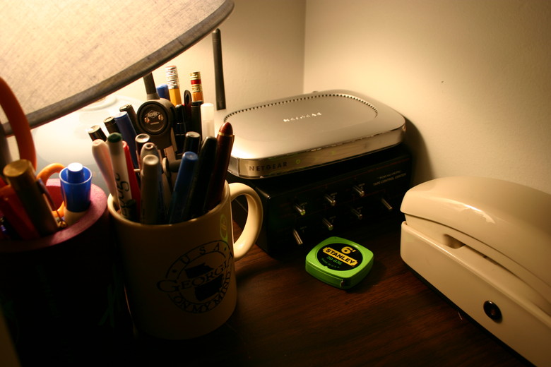 The router sits atop the audio mixer, next to the other important desk items. I rearranged my room this past Sunday